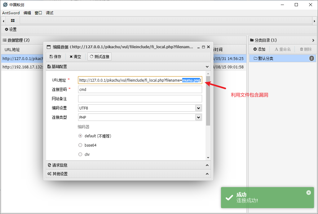 使用蚁剑进行连接,利用文件包含漏洞加载图片木马,可以成功连接。