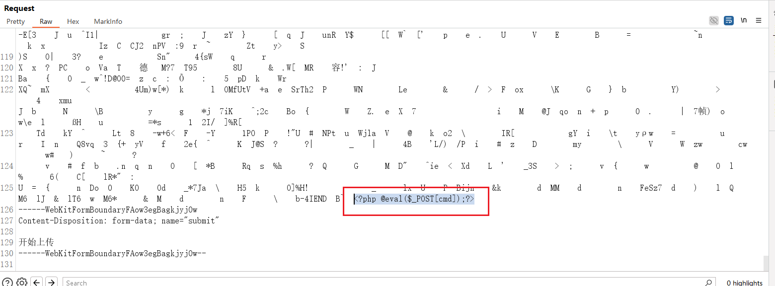 在上传图片,使用 burpsuite 抓包,可以看到一句话木马代码内容