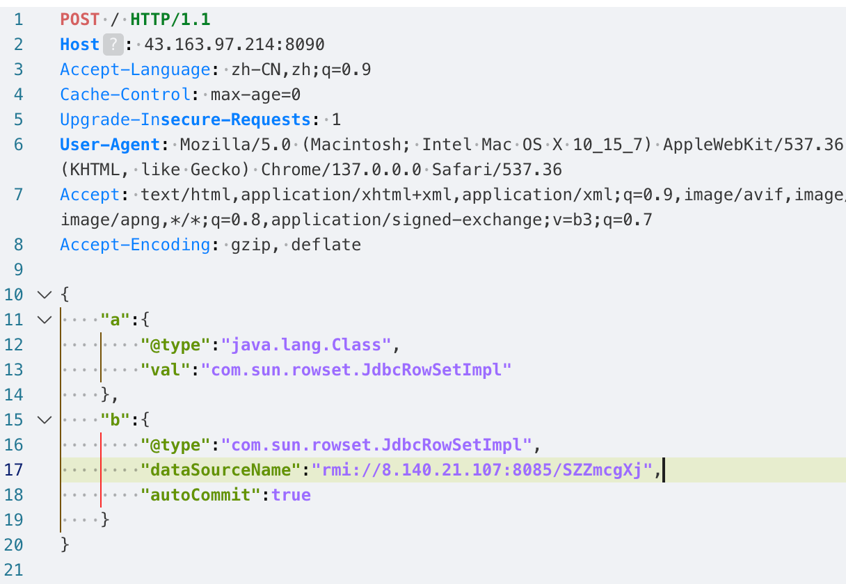 "dataSourceName":"rmi://8.140.21.107:8085/SZZmcgXj", # 反连服务器中直接复制地址