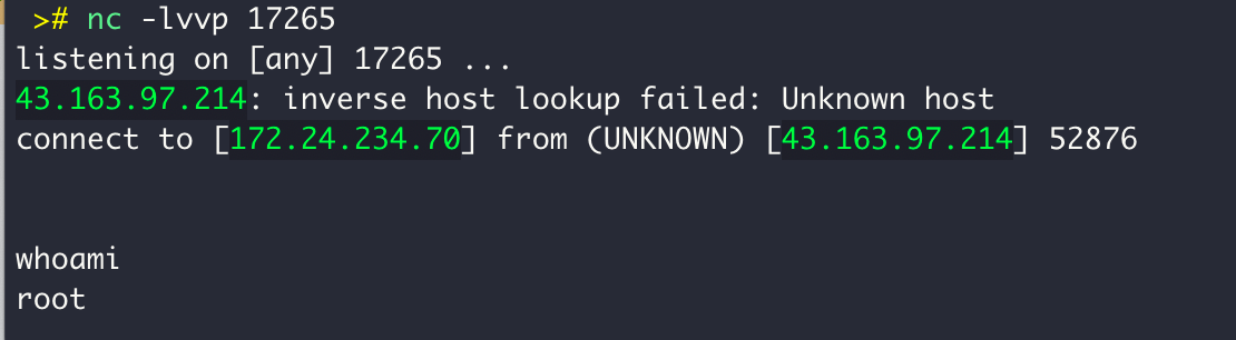 首先在 hack 服务器上面监听 17265 这个端口:nc -lvvp 17265