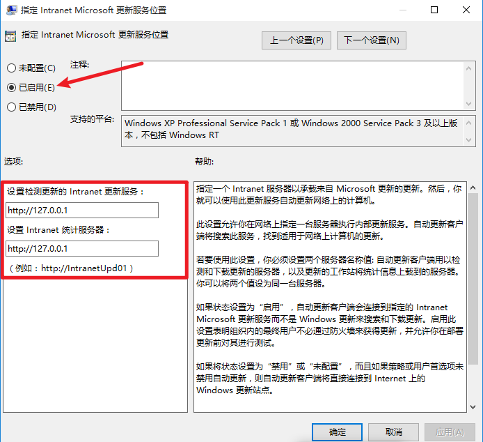 2)指定 Intranet Microsoft 更新服务位置:启用,修改网址。