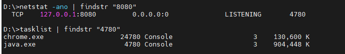 tasklist | findstr "4780"  # 通过pid查找是哪个程序占用