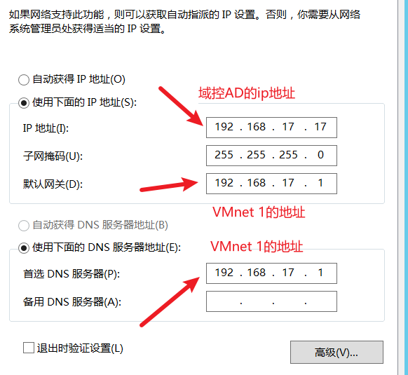 2)将==域控 AD== 的网关和 dns 服务器改为 192.168.17.1,也就是 VMnet 1 的地址。设置好后,域控就可以访问外网了。