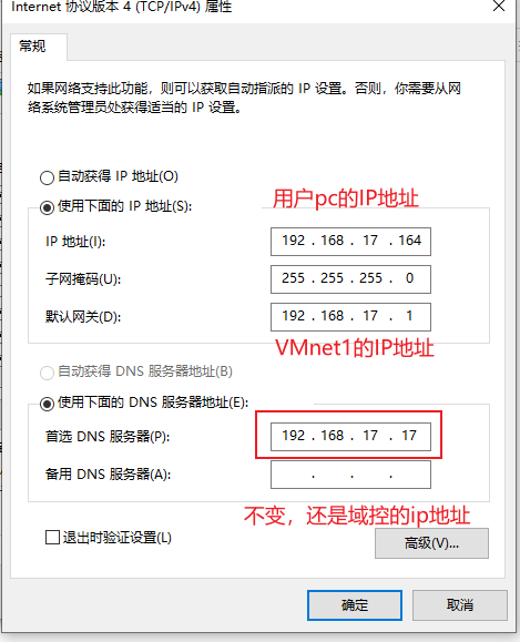 注意:用户 pc 的 DNS 服务器还是域控的 ip。因为我们在访问外网时(如 baidu.com),他会先进行 DNS 解析,将这个 DNS 请求发送给域控制器,域控制器在转发给 VMnet 1(192.168.17.1)。