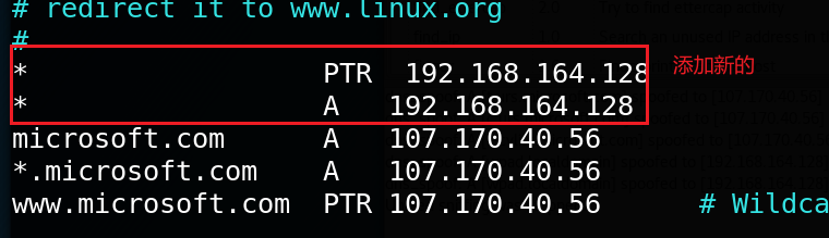 编辑:vim /etc/ettercap/etter.dns,添加新的记录