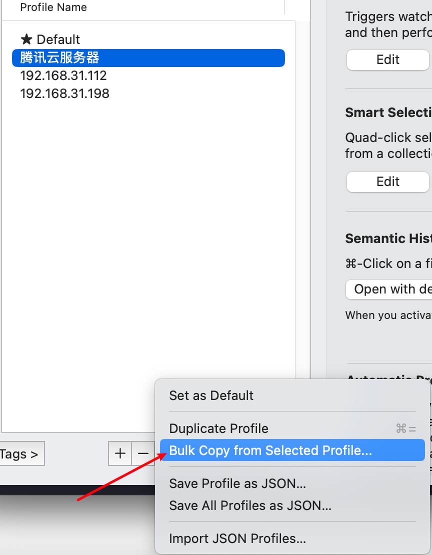 将某个 profile 配置应用到其它 profile 上面。免得一个一个配置。选择一个 profile,点击下方的这个选项
