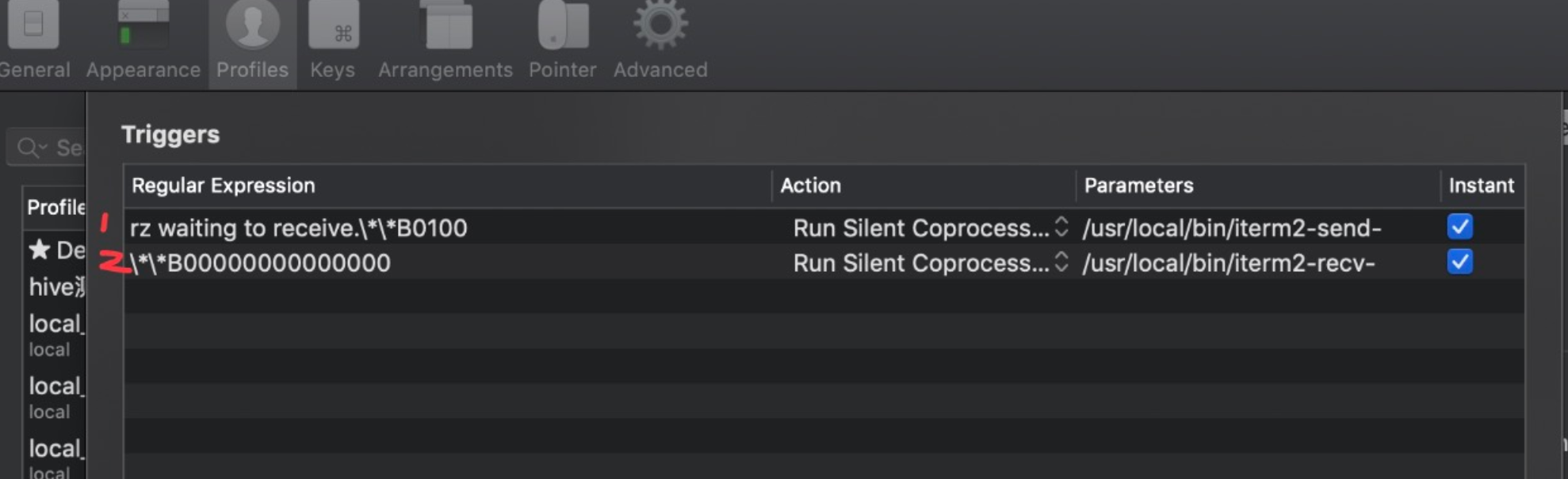 设置 Iterm2 的 Tirgger 特性,profiles->default->editProfiles->Advanced 中的 Tirgger