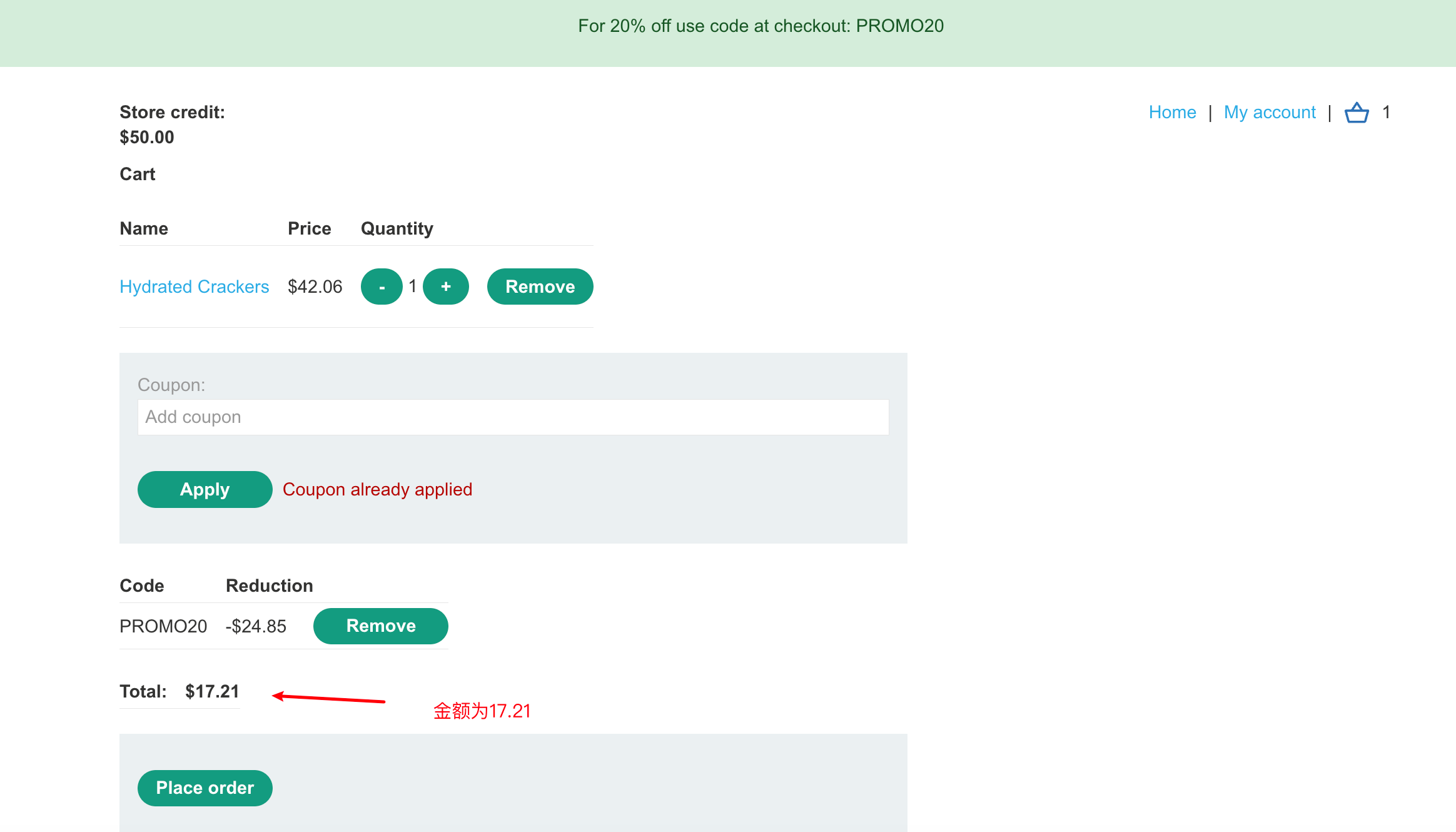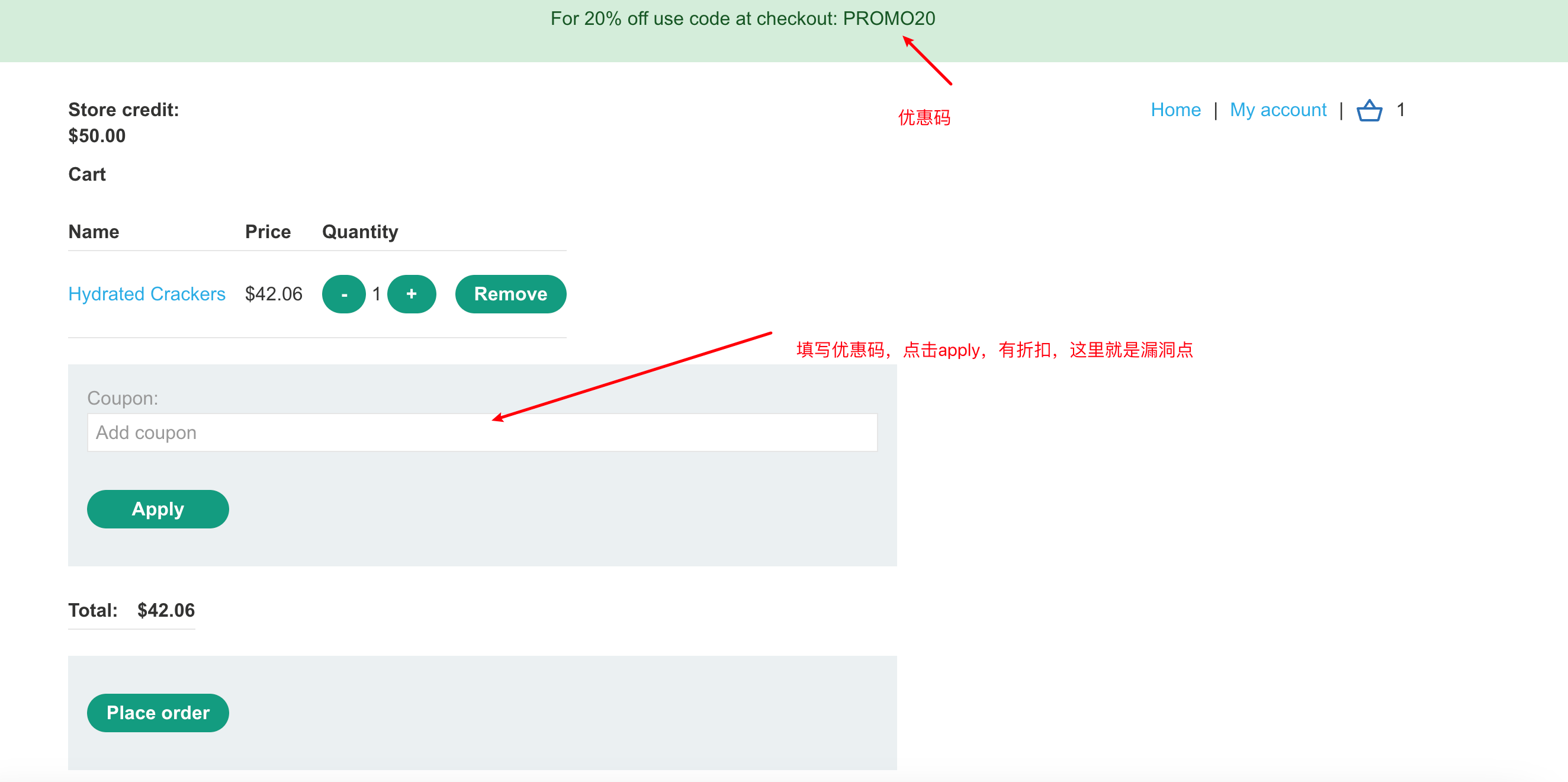 然后点击一个商品,添加到购物车,填写优惠码可以有折扣。