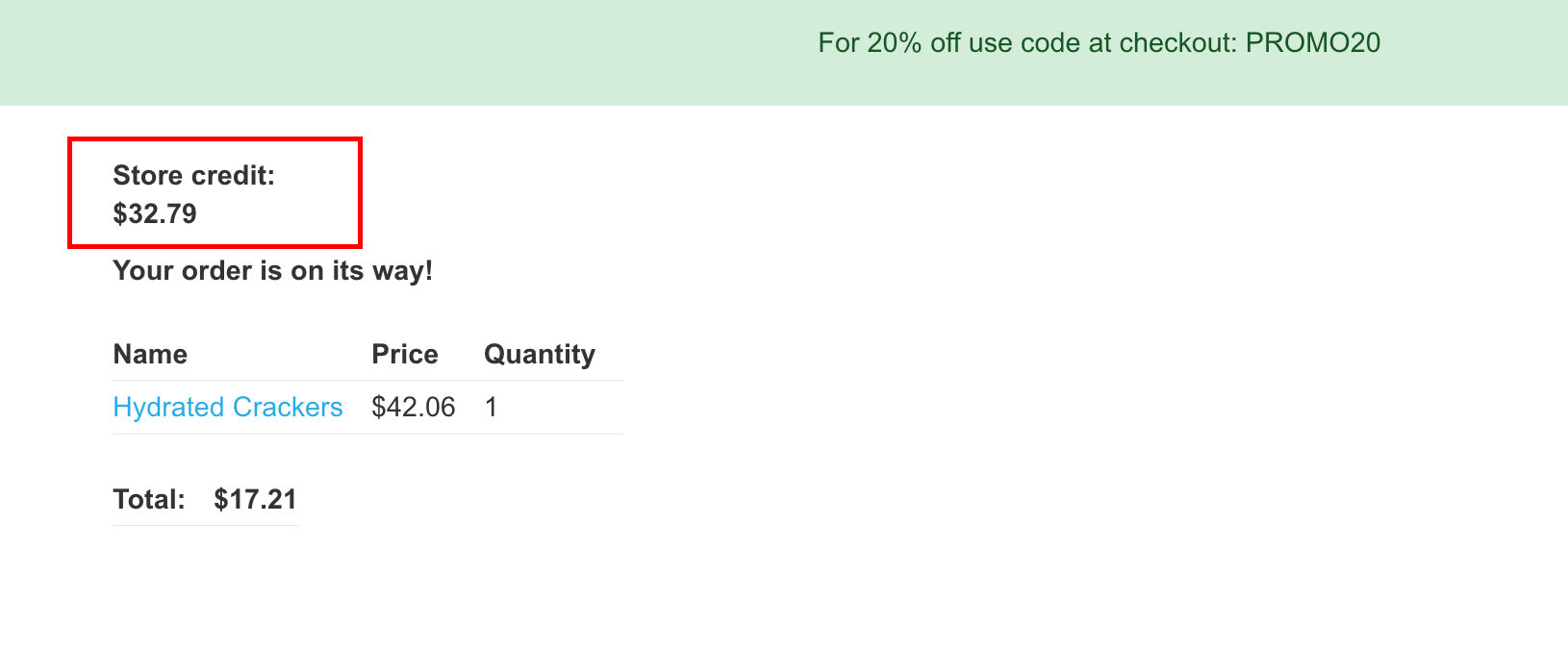 下订单,成功购买。可以看到我们的账号余额为 32.79。漏洞利用成功。