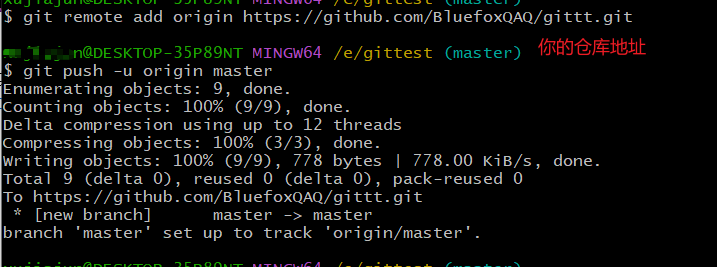 git push -u origin master # 把本地库的内容推送到远程,使用 git push 命令,实际上是把当前分支 master 推送到远程。需要输入 github 的用户名和密码。